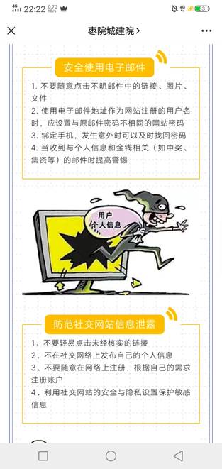 网络安全宣传周活动期间,公司积极开展线上、线下相关活动,不断强化主题宣传教育。9月16日,公司组织各班级开展了“网络安全与我同行”主题班会,通过学习相关材料,同学们了学习到了更多有关网络安全方面的内容。通过班会的学习、讨论之后,各班组织了同学们参加全民网络安全知识竞赛,激发同学们学习网络安全知识的兴趣,提升网络安全防护技能,增强安全防范意识,提高识别和应对网络危险的能力。通过公司官方微信、网站等新媒体推送网络安全知识,引导公司师生正确使用网络,提高网络道德观和法制观。多种形式广泛宣传个人网络信息保护、电信诈骗、网络暴力、网络法律维权等安全知识。