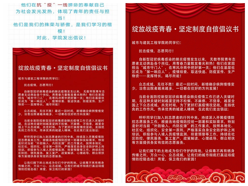 近日,为积极响应《共青团中央关于在五四期间组织开展“绽放战疫青春·坚定制度自信”主题宣传教育实践活动的通知》精神,太阳集团tyc4633充分利用网络新媒体积极开展“绽放战疫青春,坚定制度自信”主题宣传教育实践活动。