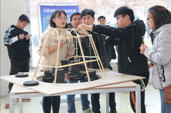 11月9日员工提交作品,并将作品进行展示。11月24日下午,举行加载比赛。最终以陈翔团队的“聚贤台”、薛志伟团队的“轻立方”等两组作品获得比赛一等奖。此外,比赛过程中为了突破极限探索最大竖向荷载加载量,以马宁团队的作品“穹顶之下”,以其模型自重360g,最大竖向加载量130KG,载重比为360:1,赢得评为和观众的一致好评。