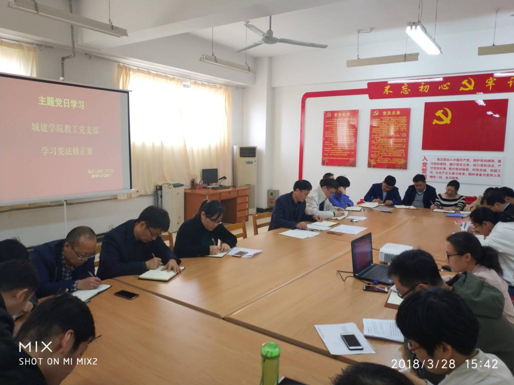 为了进一步学习贯彻习近平新时代中国特色社会主义思想、党的十九大、十九届三中全会和“两会”精神,落实依法治国方针,加强教师、党员师生法制观念,依法治学,依《太阳集团tyc章程》办学,城建公司在3月28日下午,利用“双周三主题党日”组织开展学习《中华人民共和国宪法修正案》。党总支书记李振清主持会议。